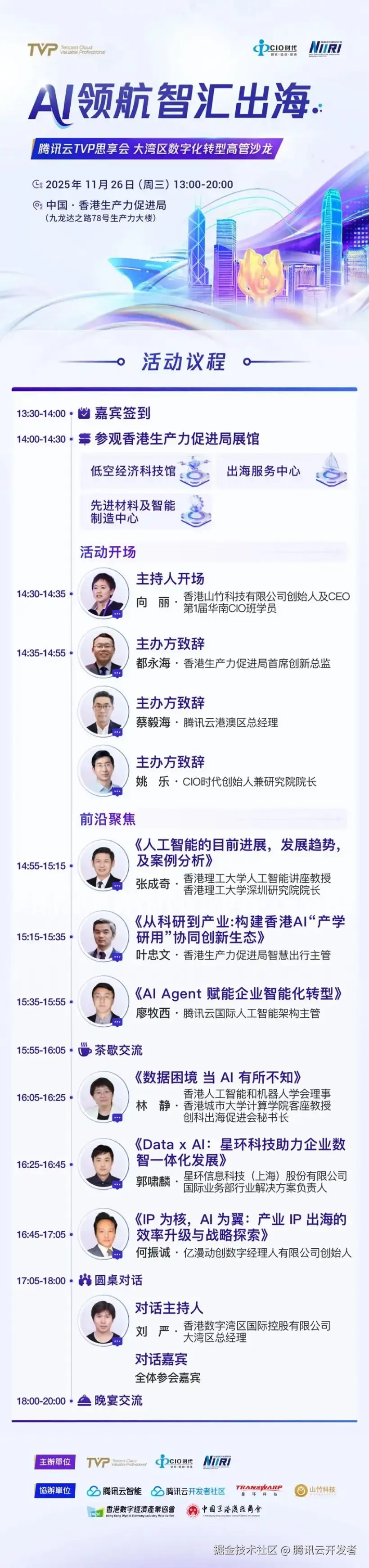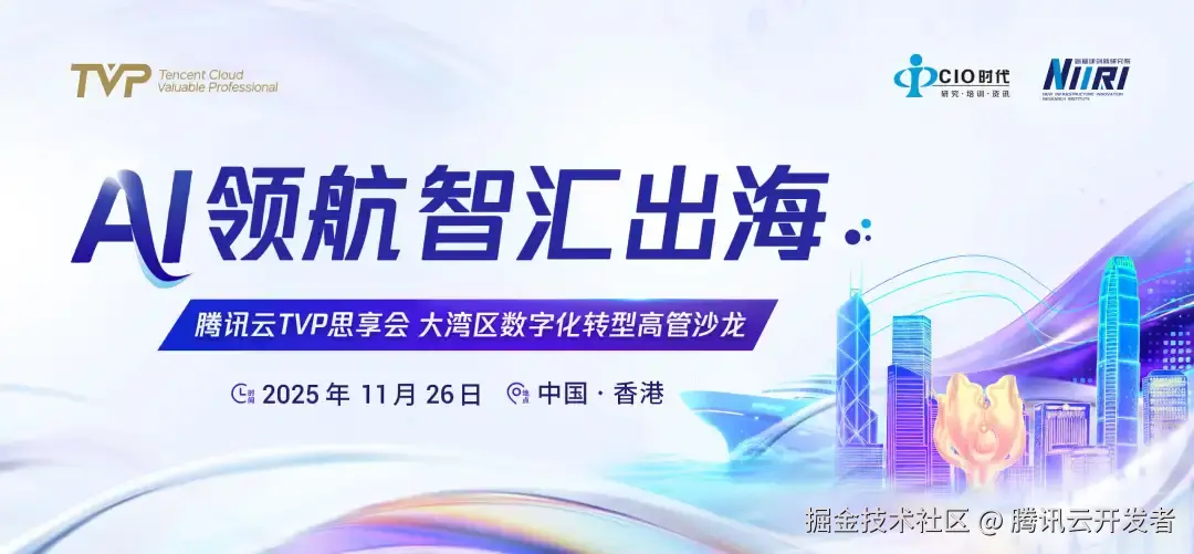 11 月 26 日(周三) ,TVP 首场香港活动即将重磅启幕!本次 「腾讯云 TVP 思享会」 特邀粤港澳大湾区领军企业、携手 AI 领域顶尖专家学者,围绕 "AI 领航 智汇出海" 展开深度对话,共探 AI 赋能企业出海新路径,推动大湾区数字化转型与跨境发展提质增效。
