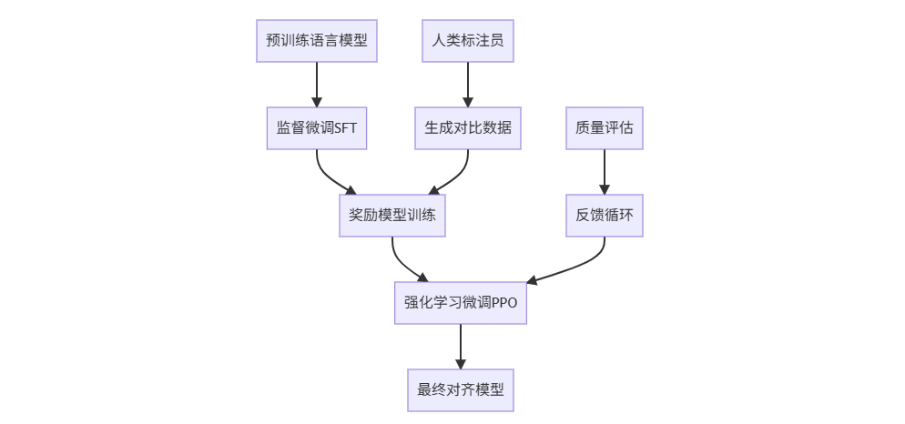 预训练语言模型 监督微调SFT 奖励模型训练 强化学习微调PPO 最终对齐模型 人类标注员 生成对比数据 质量评估 反馈循环