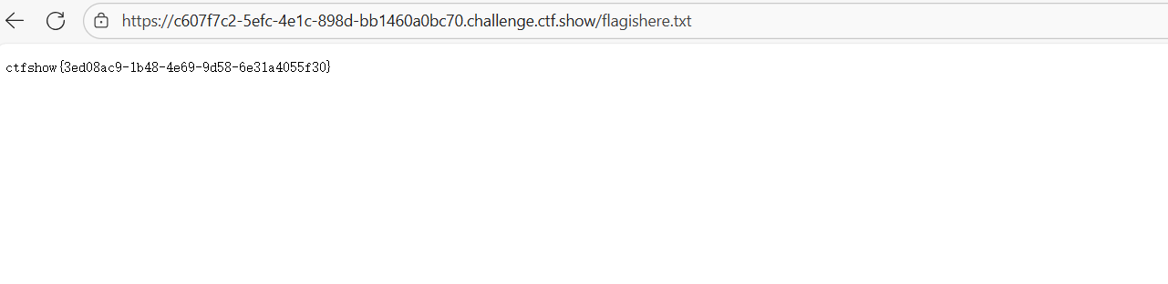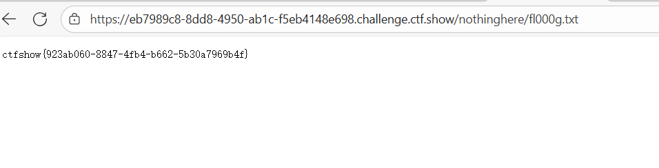 最终我们在var/www/html/nothinghere/fl000g.txt这个路径找的到了flag,我们在url后面添加nothinghere/fl000g.txt,就得到了flag:ctfshow{0c219eff-1197-4c03-86dc-ef4b28793e2f}