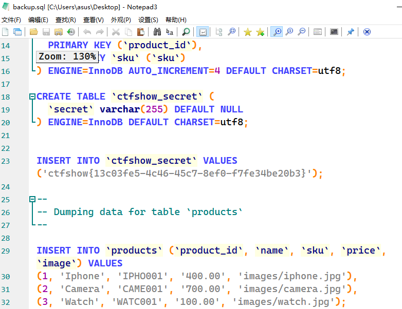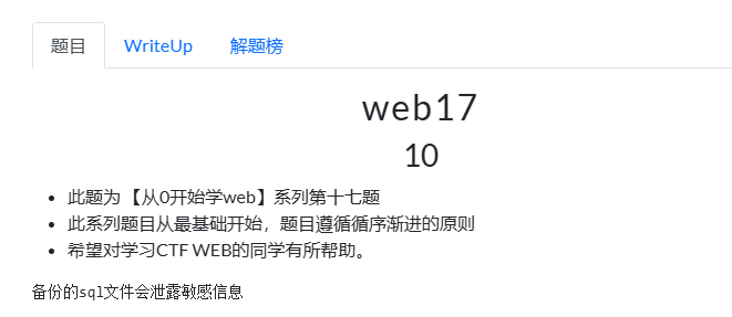 python dirsearch.py -u https://c172e072-fe1c-43c9-a95c-4d718878d640.challenge.ctf.show/ 会发现一个backup.sql的文件 加上去访问就可以了