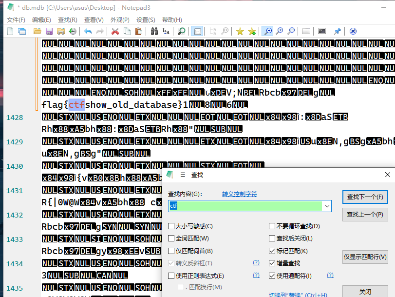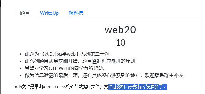 mdb文件是早期asp+access构架的数据库文件,文件泄露相当于数据库被脱裤了。 根据提示'mdb文件是早期asp+access构架的数据库文件 直接查看url路径添加/db/db.mdb 下载文件通过txt打开或者通过EasyAccess.exe打开搜索flag ' 在url后加入/db/db.mdb然后用notepad++打开搜索flag即可得到答案