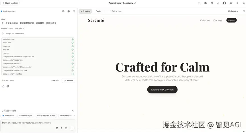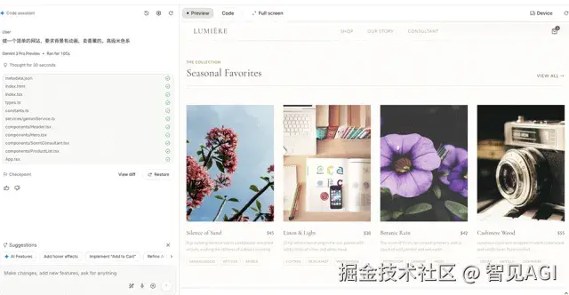 这次发布会除了在 Google AI Studio 里新增的 preview 预览功能之外,更关键的是它背后所体现出的 Gemini 3 在整体设计能力上的跃升。上一代模型往往更关注"把功能做出来",界面风格、配色和版式需要我们手动调整;而这一次,可以明显感觉到 Gemini 3 在审美、布局一致性、风格协调等方面已经更像一位懂设计的合作者。哪怕只给一句模糊描述,它给出的界面也更统一、更现代、更像"产品级作品"。preview 功能只是入口,让我们能看见并标注要修改的细节;但真正的变化是:Gemini 3 默认就能把产品做得更美、更完整。
