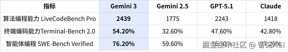 Gemini 3 在代码生成、终端操作、自动修复程序(SWE-Bench)等任务上全面领先。它不仅能写代码,还能理解系统行为并执行多步骤任务,真正适合作为 Agent 的"技术执行层"。