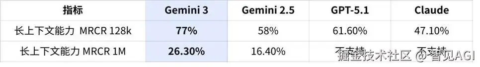 Gemini 3 的长上下文能力比 Gemini 2.5 提升巨大,在 128k 和 1M token 上都更稳定。对合规文档、长篇论文等任务帮助巨大。