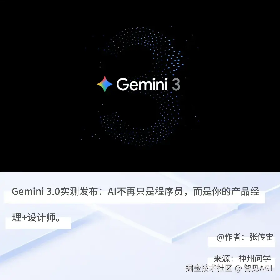 紧随 Grok 4.1 发布之后,AI 界最重磅的消息无疑是 Gemini 3.0 的亮相。这次 Gemini 从 2.5 到 3.0 并不只是一次"参数升级"、支持更多 token 或更稳定的上下文输入,而是一种全新的开发方式革新。无论是推理、多模态、前端生成,还是智能体整体的构建体验,Gemini 3 都带来了肉眼可见的跨代差距。今天我们就带来一份新鲜出炉的Gemini 3.0 实测报告。