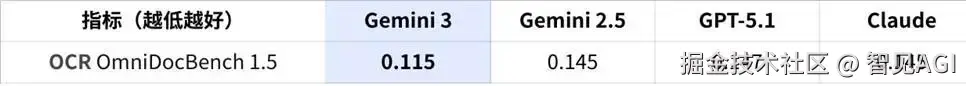 在 OCR 评测中,Gemini 3 的编辑距离最低、识别最准确,尤其擅长结构化文档、扫描件、合同和工程图纸。