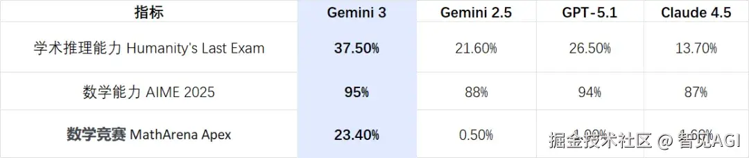 Gemini 3 在高难推理类任务中展现出跨代跃迁式的进步。无论是抽象逻辑、数学竞赛难度的题目还是综合推理场景,它都显著领先 Gemini 2.5、GPT-5.1 与 Claude。这类任务反映模型的深度思考能力,是智能体进行决策、金融分析和业务判断的重要基础。