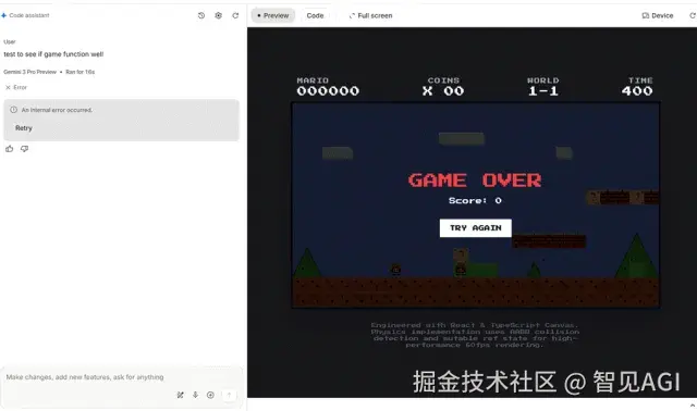 在游戏生成的场景中,Gemini 2.5 Pro 与 Gemini 3.0 Pro Preview 的差异最为明显。Gemini 2.5 Pro 虽然能够实现基础玩法(平台、跳跃、重力逻辑等),但画面非常粗糙:色彩简单、像素细节缺失、角色造型只是基础方块,整体更像工程原型。而 Gemini 3.0 Pro Preview 在同样提示下生成的画面明显更接近真实游戏:像素风格统一、色彩更协调、元素细节丰富, HUD、砖块、地形的表现都更成熟,整体视觉品质提升是跨代的。不过也需要注意的是,在多次生成过程中,Gemini 3.0 Pro Preview 在游戏和 3D 渲染任务中出现了多次崩溃,稳定性远不如 Gemini 2.5 Pro。