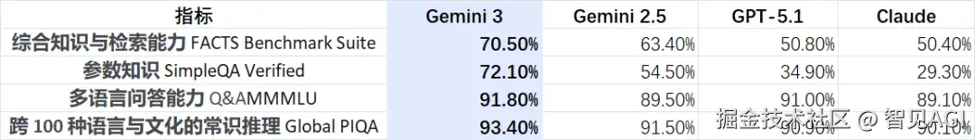 在涵盖知识问答、事实检索、多语言、多文化常识等几十项指标中,Gemini 3 都表现稳定且处于第一梯队