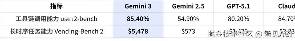 Gemini 3 在推理、多模态、视觉解析、编程、Agent 工具调用、长时序任务和长上下文处理上全面领先。