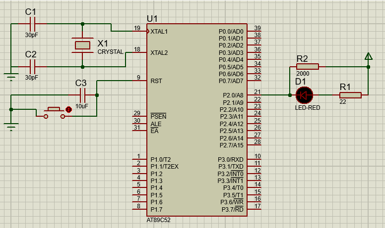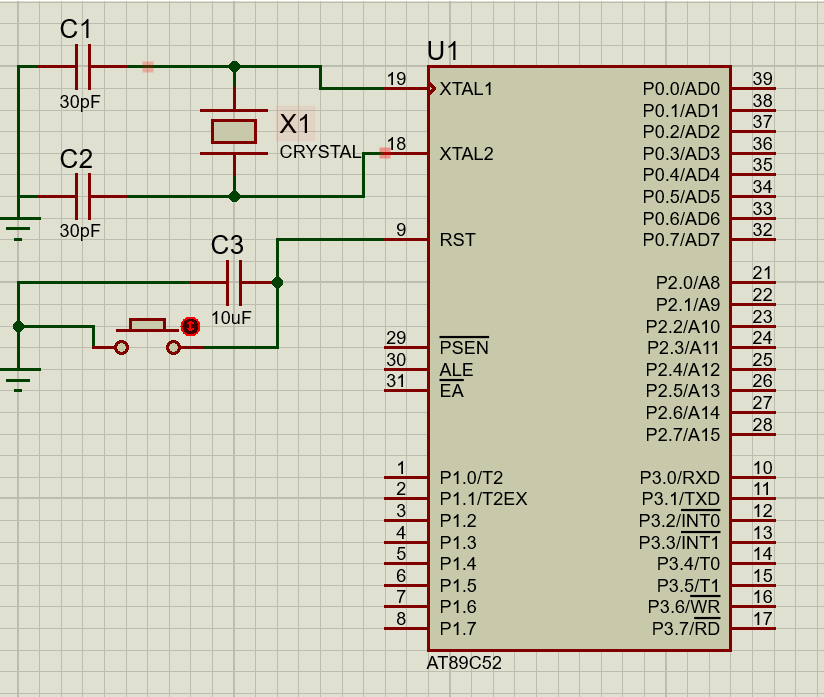 常用元器件关键词:AT89C52、BUTTON、CAP、CRYSTAL、LED-RED、RES。