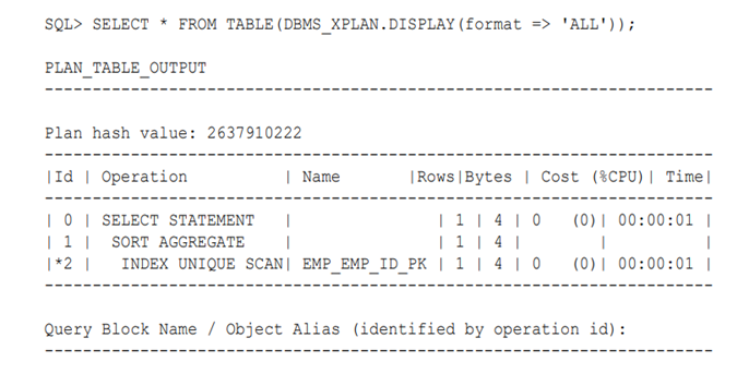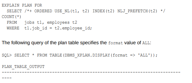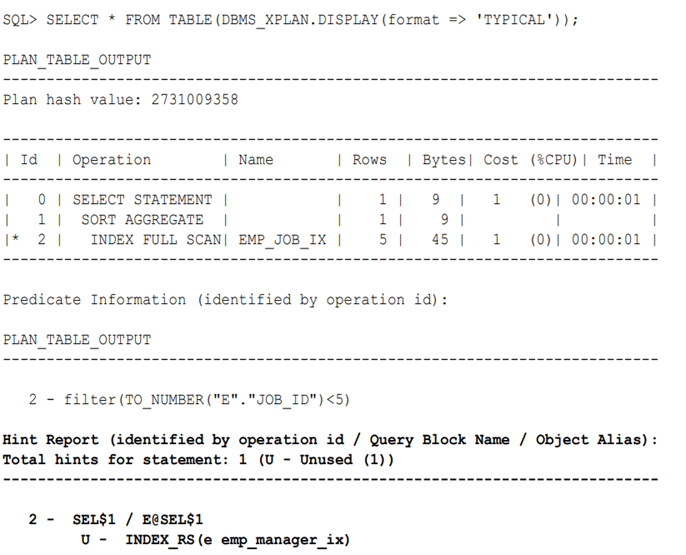 以下查询将显示执行计划的所有部分,包括提示符使用信息(包含示例输出):