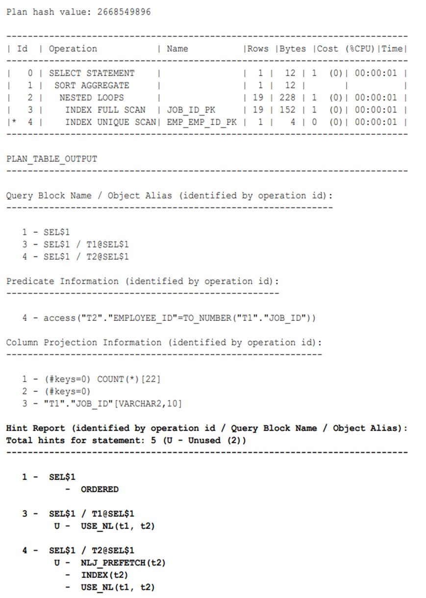 The preceding report shows that two hints were not used: USE_NL(t1, t2) and NLJ_PREFETCH(t2). Step 3 of the plan is an index full scan of the jobs table, which uses the alias t1. The report shows that the optimizer did not apply the USE_NL(t1, t2) hint for the access of jobs. Step 4 is an index unique scan of the employees table, which uses the alias t2. No U prefix exists for USE_NL(t1, t2), which means that the optimizer did use the hint for employees.
