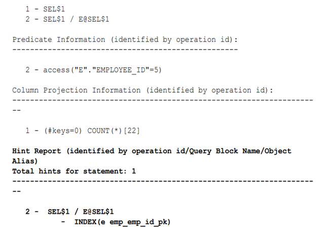 The Hint Report section shows that the query block for the INDEX(e emp_emp_id_pk) hint is SEL1. The table identifier is E@SEL1. The line number of the plan line is 2, which corresponds to the first line where the table E@SEL$1 appears in the plan table.