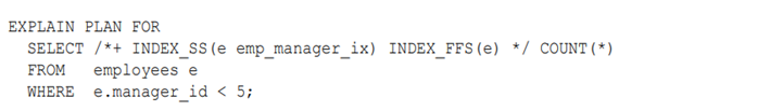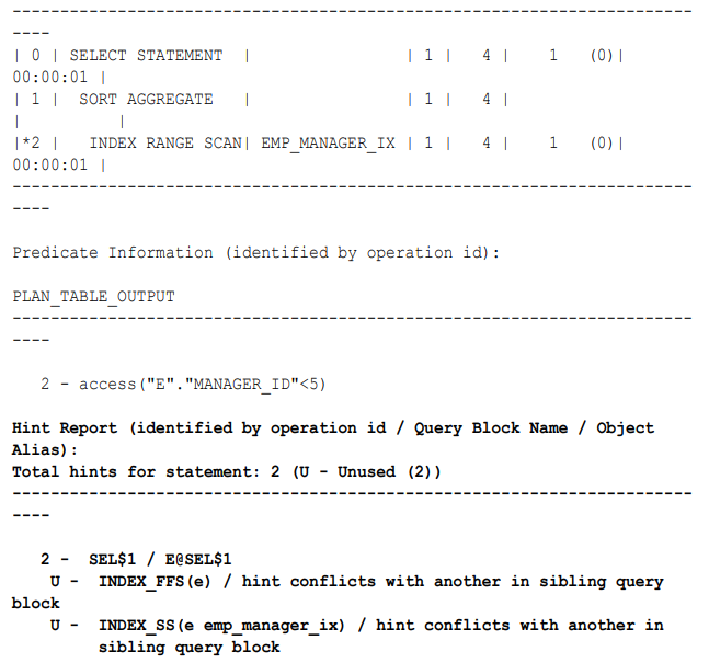 The preceding report shows that the INDEX_FFS(e) and INDEX_SS(e emp_manager_ix) hints conflict with one other. Index skip scans and index fast full scans are mutually exclusive. The optimizer ignored both hints, as indicated by the text U --- Unused (2). Even though the optimizer ignored the hint specifying the emp_manager_ix index, the optimizer used this index anyway based on its cost-based analysis.