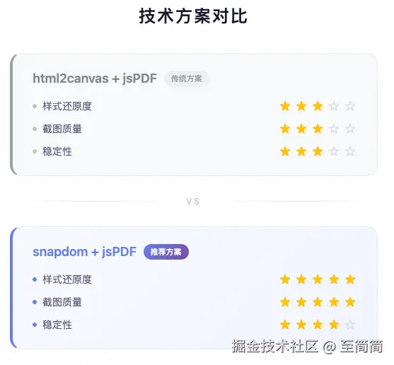 传统的 html2canvas + jsPDF 方案虽然能用,但在样式还原度 和截图质量上存在明显不足。