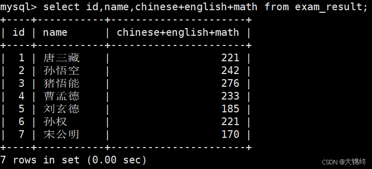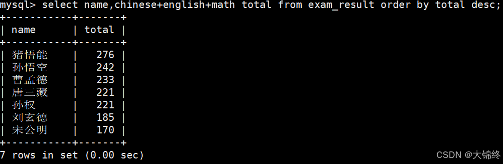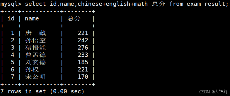 SELECT AVG(chinese + math + english) 平均总分 FROM exam_result;