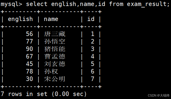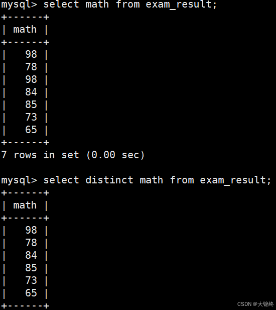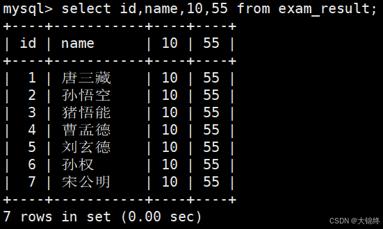 - select语句中允许直接输出常量值,这些常量值会作为 "虚拟列" 在结果集中重复显示,每行的取值都固定为你指定的常量。这种用法常用于生成辅助信息、测试场景(比如临时添加标记列)