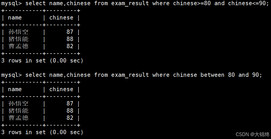 - 语文成绩在 [80, 90] 分的同学及语文成绩