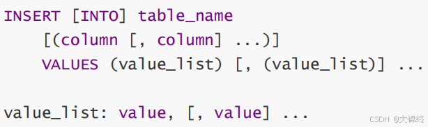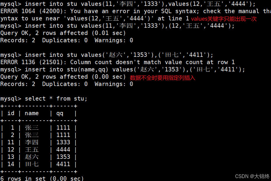 一次仅插入一条数据,数据的数量、顺序必须和定义表中的一致,如果每个数据都要插入那么就不用指定要插入数据的列,就叫全列插入,如果插入数据不全就要指定插入列
