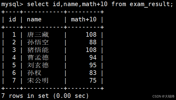 SELECT:选择要显示的列,此时才会定义别名(如 SELECT score+10 AS add_score);