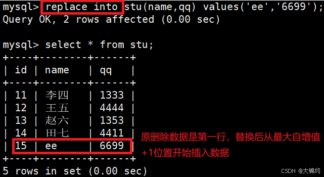 主键 或者 唯一键 如果冲突,则删除后再插入,注意新插入位置从当前最大子增值+1的位置处开始,相当于从表尾位置新插入数据,而不是原位置插入