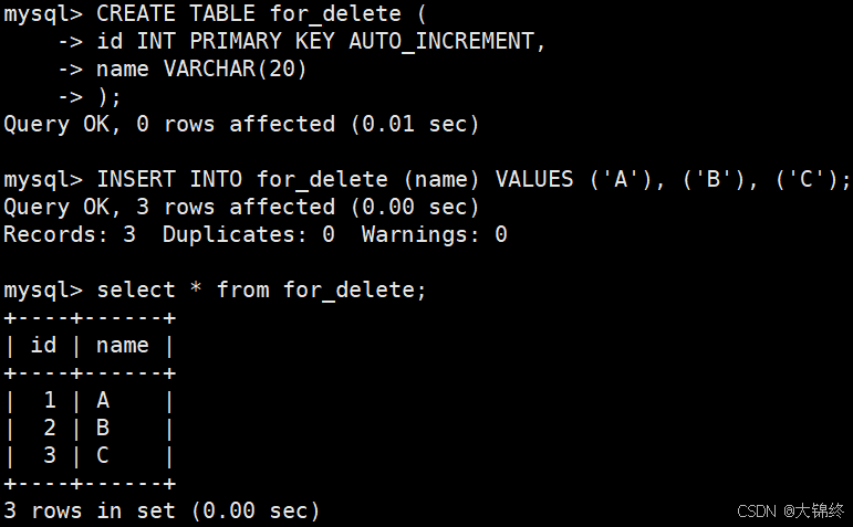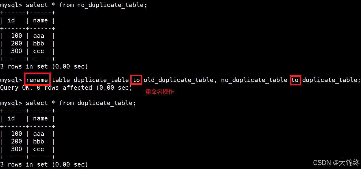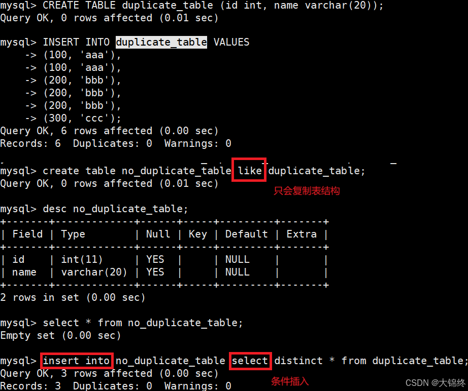 2.采用两张表的方式来实现,先创建一个空表,再将原表中去重数据添加进去,最后进行重命名完成。为什么这样?因为能确保操作和数据的稳定性,避免直接对原数据进行修改,如果出现错误可以直接删除新表,重新对原表进行操作,相当于留有备份