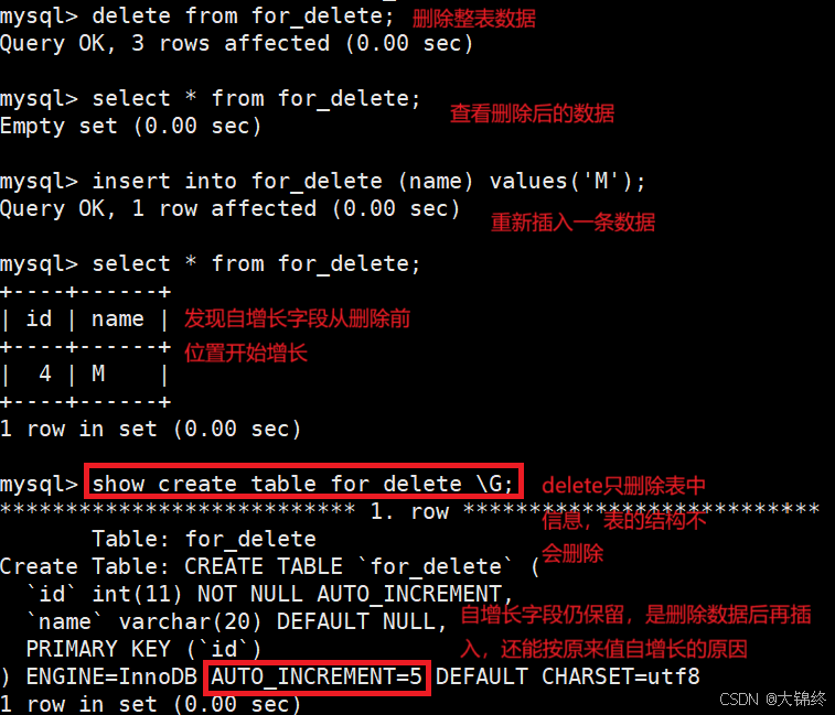 当删除整表时,若设置了自增长字段,通过show可以发现即使表数据都被删除了,但创建的字段信息都存在,并且自增长计数器不变,所以delete是dml语句(数据操纵语言)