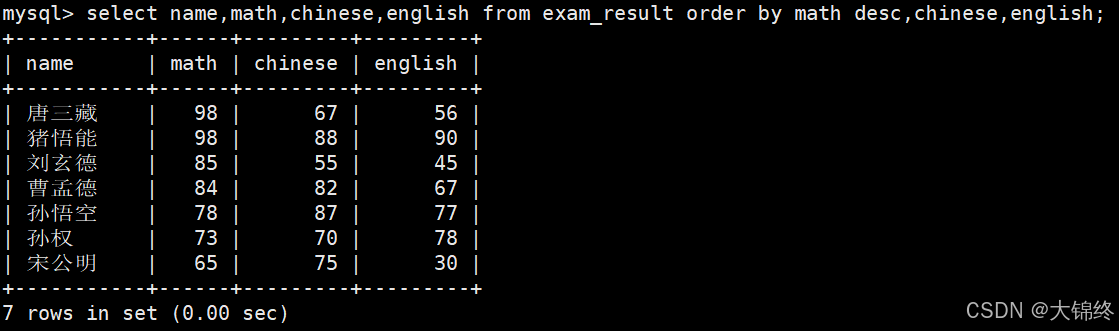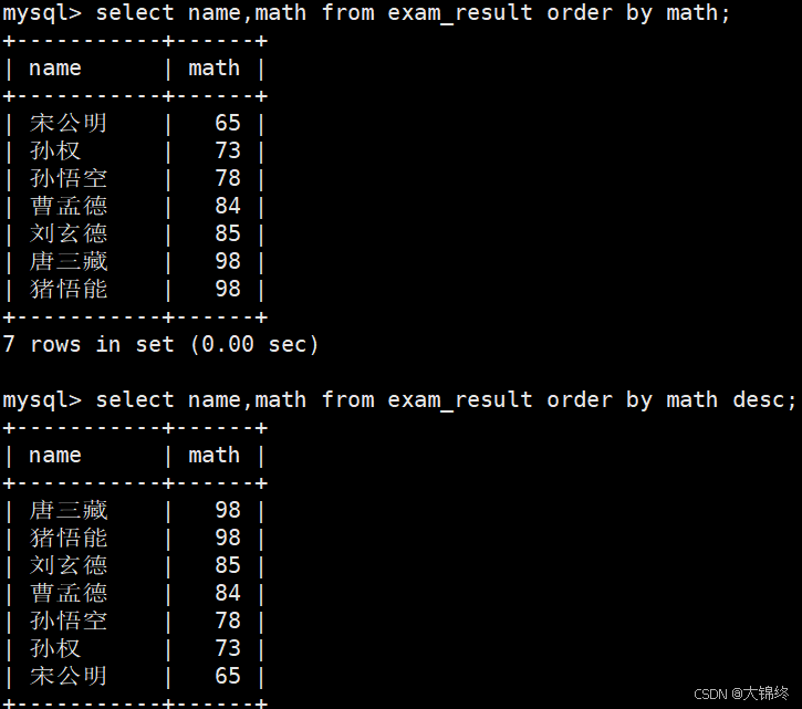 2.null认为比任何值都小,升序出现在最上面,降序出现在最下面 - 查询单门成绩,按升降序来排列: