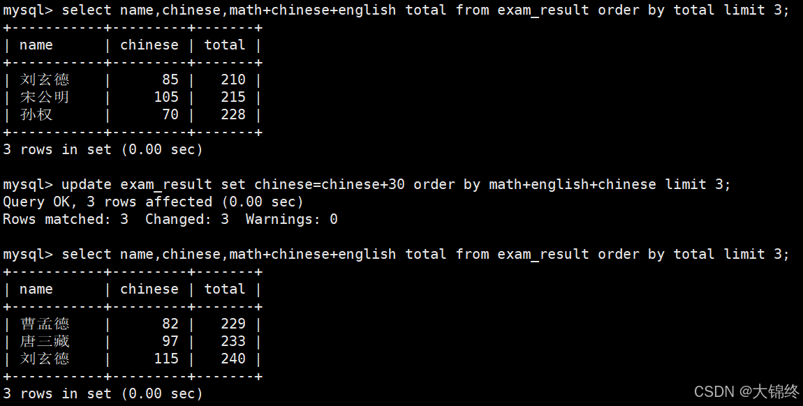 update可与where条件筛选、order by排序语句、limit分页语句等一起使用,更新成绩后总排名发生了变化。