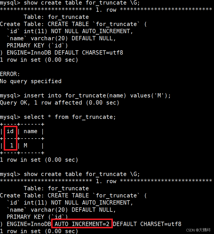 当对表执行 TRUNCATE 后,表数据被清空,同时自增计数器会被重置为初始状态(逻辑上回到未插入数据时的状态)。此时执行 show create table,AUTO_INCREMENT 字段会消失 ------ 因为 MySQL 认为自增计数器尚未被初始化。只有再次插入数据,MySQL 才会重新确定自增的起始值(从 1 开始),并在 show create table 中显示 AUTO_INCREMENT=2(下一次自增的目标值)。