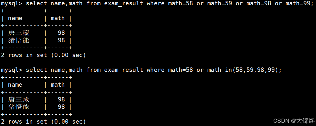 - 数学成绩是 58 或者 59 或者 98 或者 99 分的同学及数学成绩
