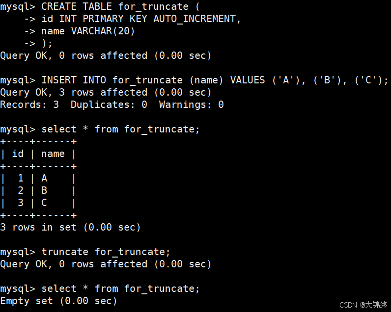2.实际上 MySQL 不对数据操作,所以比 DELETE 更快,但是TRUNCATE在删除数据的时候,并不经过真正的事物(后续学习),所以无法回滚