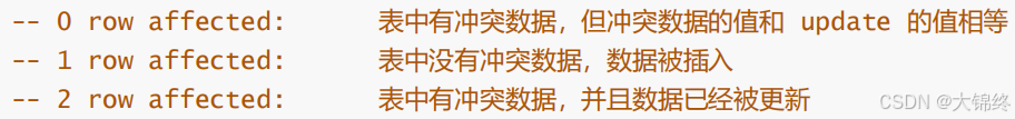 0 行受影响:表数据没任何变化(可能是冲突,也可能是没匹配到数据、更新后值没变化);