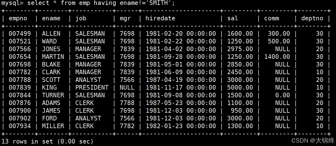 无 GROUP BY 时,HAVING 会退化为 WHERE(MySQL 特有行为):