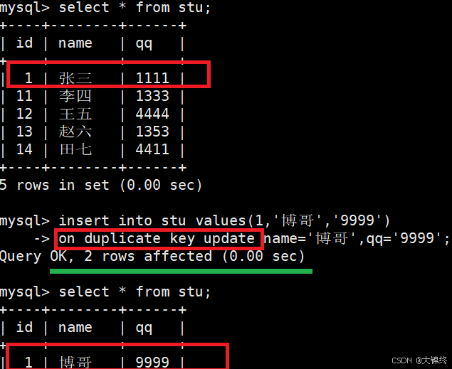 绿色线标记初的2 rows affected是什么意思?表中受到影响的数据行数,受影响不仅是数据冲突