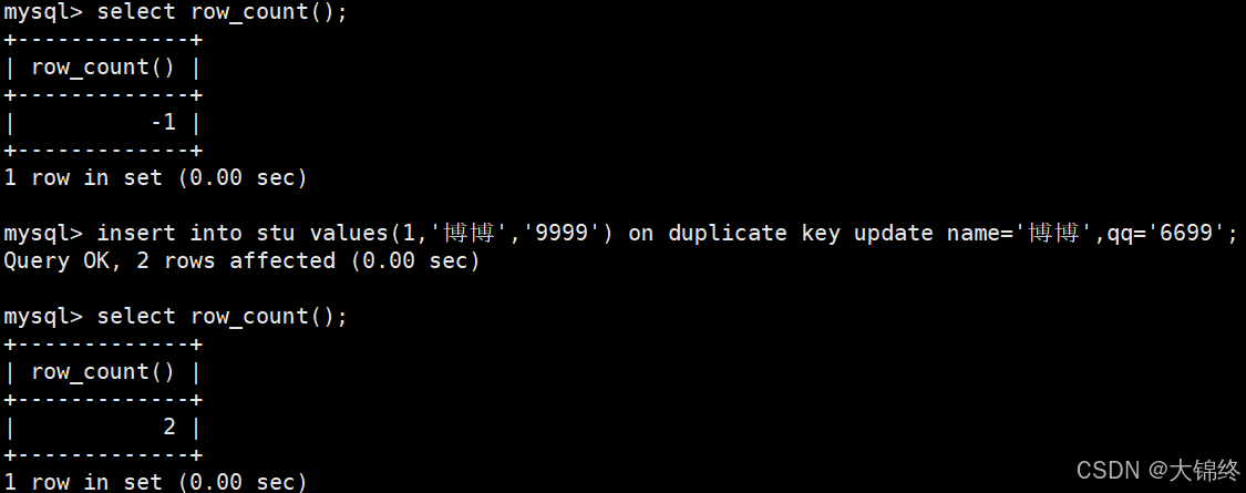 2 行受影响:表中新增 / 删除 / 修改了 2 条数据(可能是无冲突批量操作,也可能是冲突后通过特殊规则允许执行,比如 ON DUPLICATE KEY UPDATE)。 - 通过ROW_COUNT() 函数获取受到影响的数据行数
