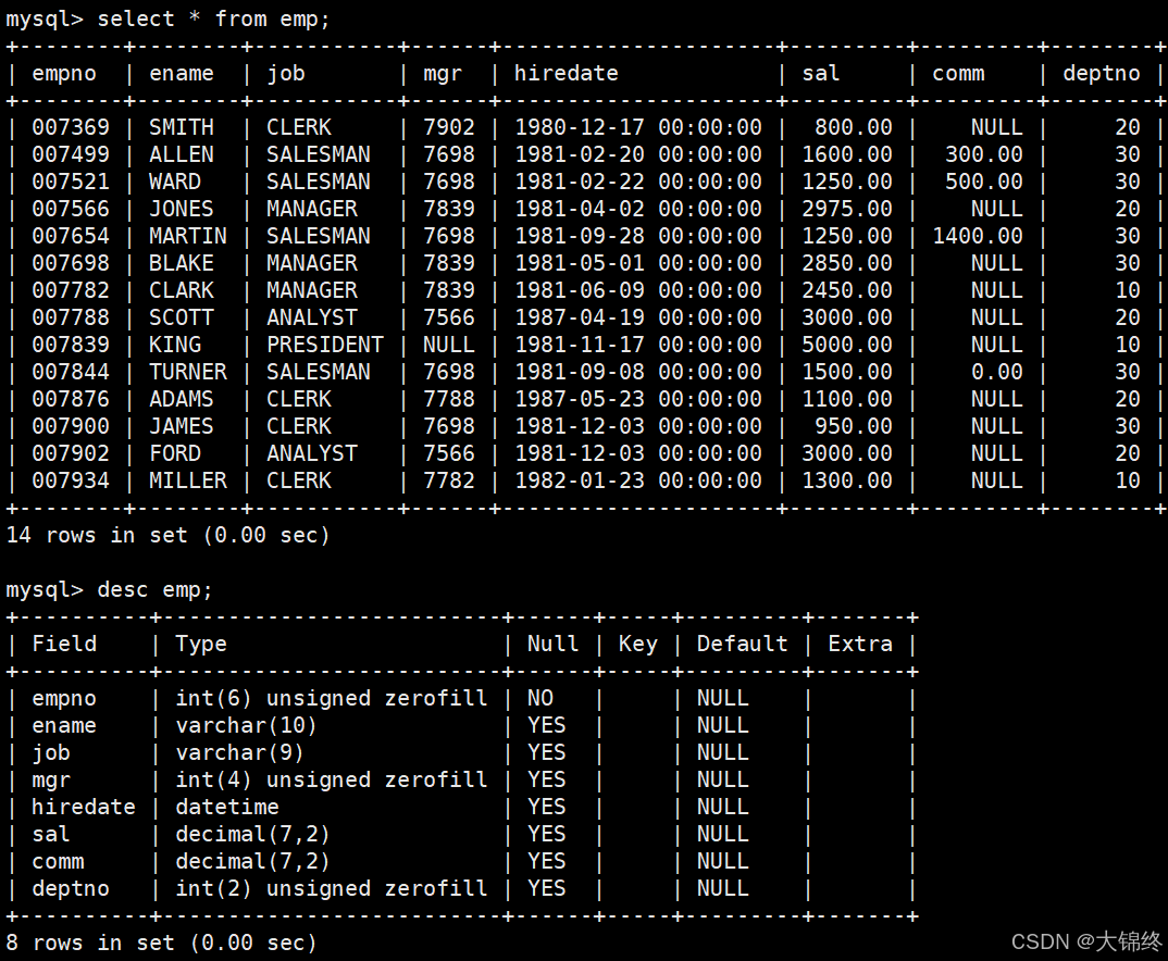 select column1, column2, ... from table group by column; - 测试,准备一个雇员信息表