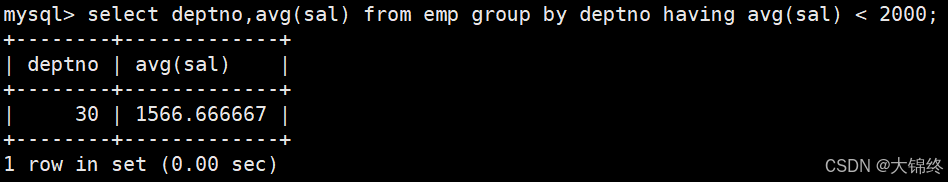 HAVING:过滤分组后的结果(若有,可使用聚合函数);
