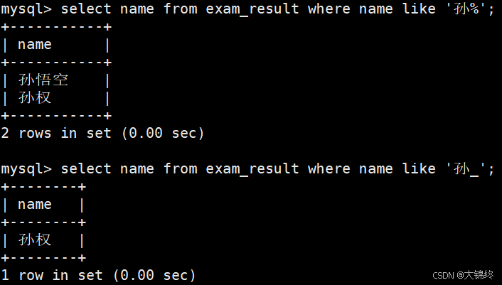 姓孙指名字可以有多个字,孙某规定只能两个字,需要模糊匹配like,分别用%和_。
