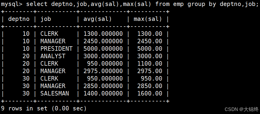 通过group by指定列名,实际是用该列的不同行数据来进行分组的 - 显示每个部门的每种岗位的平均工资和最低工资