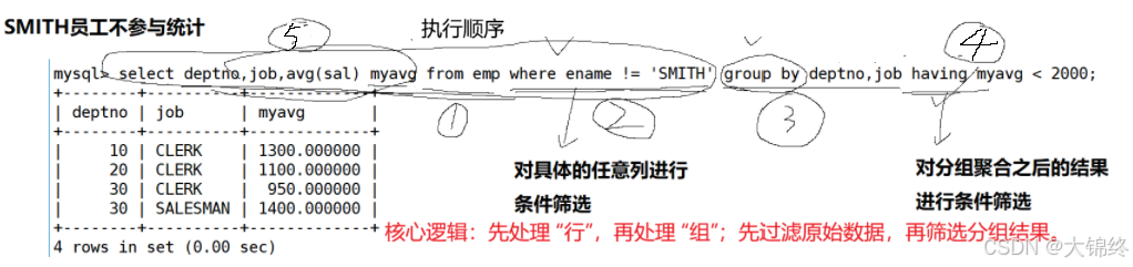 简单记:WHERE 管行,HAVING 管组;聚合之前用 WHERE,聚合之后用HAVING
