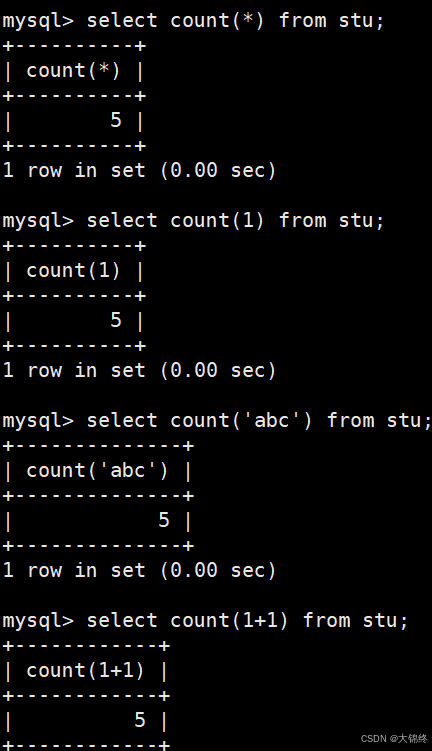 3.不止数字,任何结果非 NULL 的常量表达式(如字符串、确定运算)都能实现同样效果。 - 关于其他聚合函数的使用都相同,以语句为例