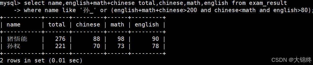 - 孙某同学,否则要求总成绩 > 200 并且 语文成绩 < 数学成绩 并且 英语成绩 > 80