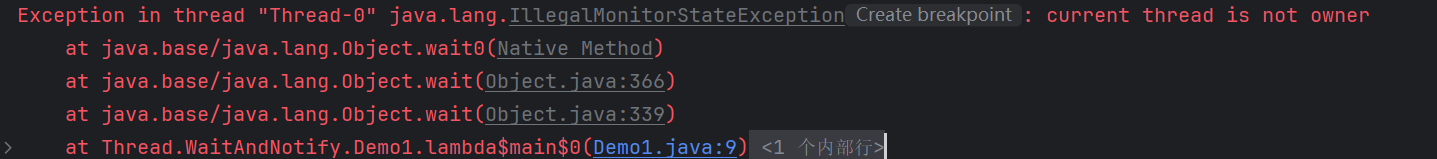 在这里我们在synchorized的锁对象和wait的对象不同,我们发现代码抛出了监视器状态异常,这其实就是lock1释放锁的时候lock1对象并没有加锁