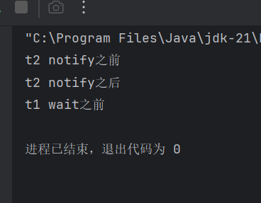 - 但是当我们在t1里面加上wait方法之后我们发现代码并没有陷入循环 原因就是wait方法释放了锁导致t2有机会获得锁