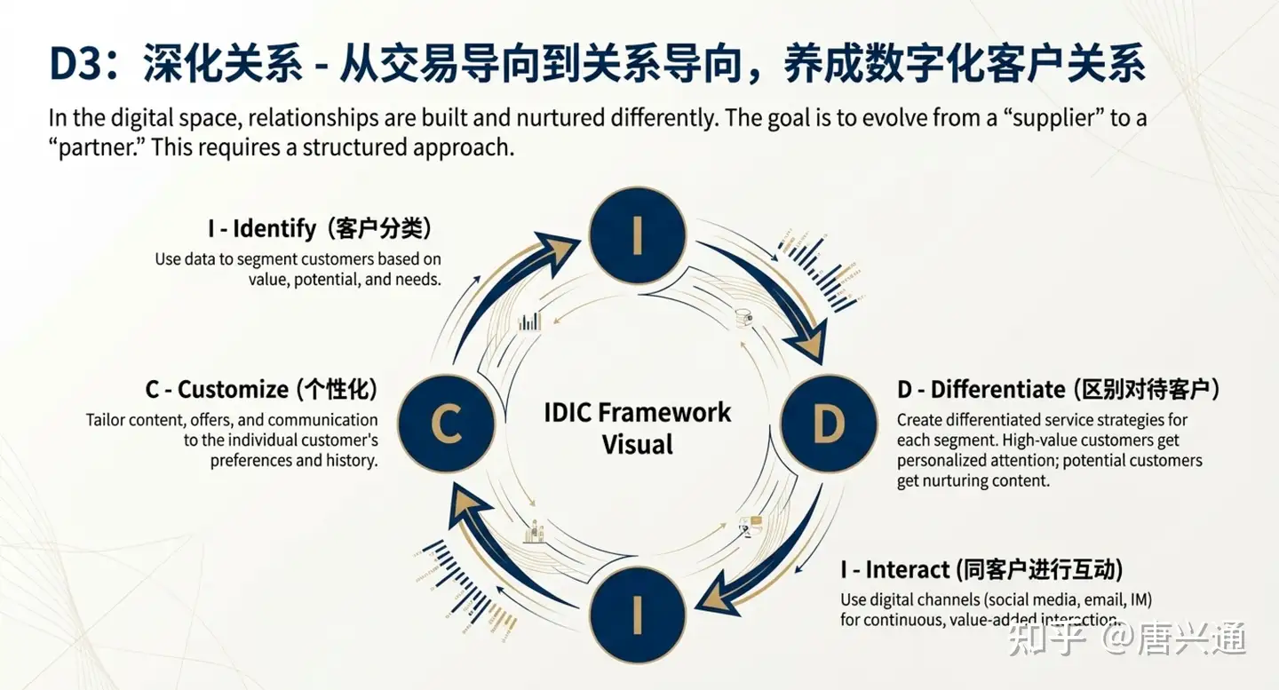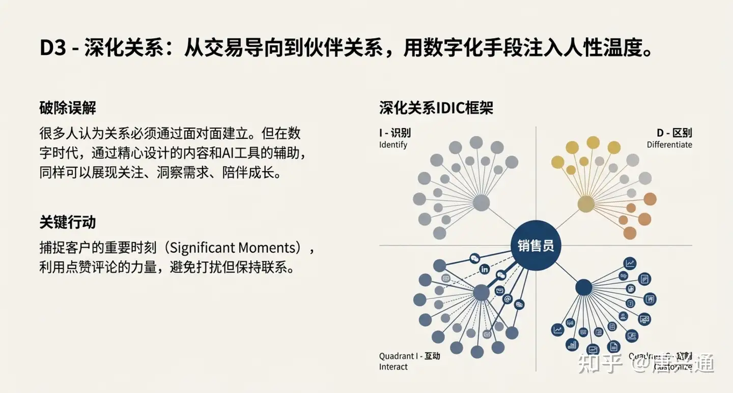 这一维度类似于销售的情感部分,它强调的是人与人之间的互动和沟通。在深化关系的过程中,销售人员需要展示出真诚和同理心,与客户建立起深厚的情感联系,从而促进长期的合作和信任。
