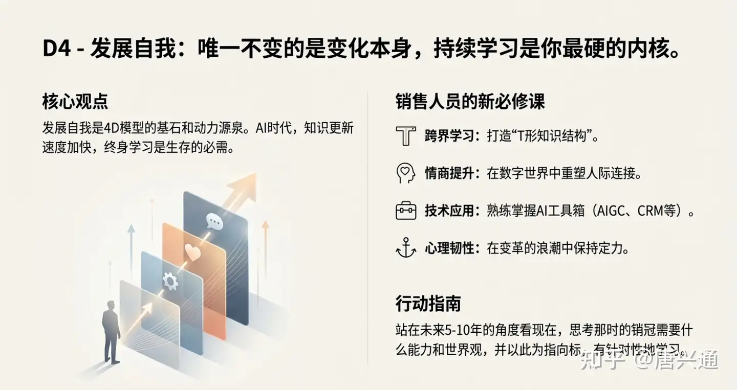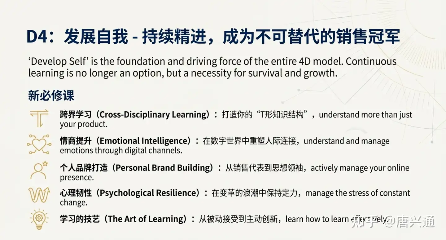 在4D销售力模型中,发展自我就像是销售人员的腿,它支撑着整个销售过程,并为销售人员的可持续发展提供动力。通过不断地学习和自我提升,销售人员能够保持对最新市场趋势和技术的敏感度,从而在竞争中保持领先地位。