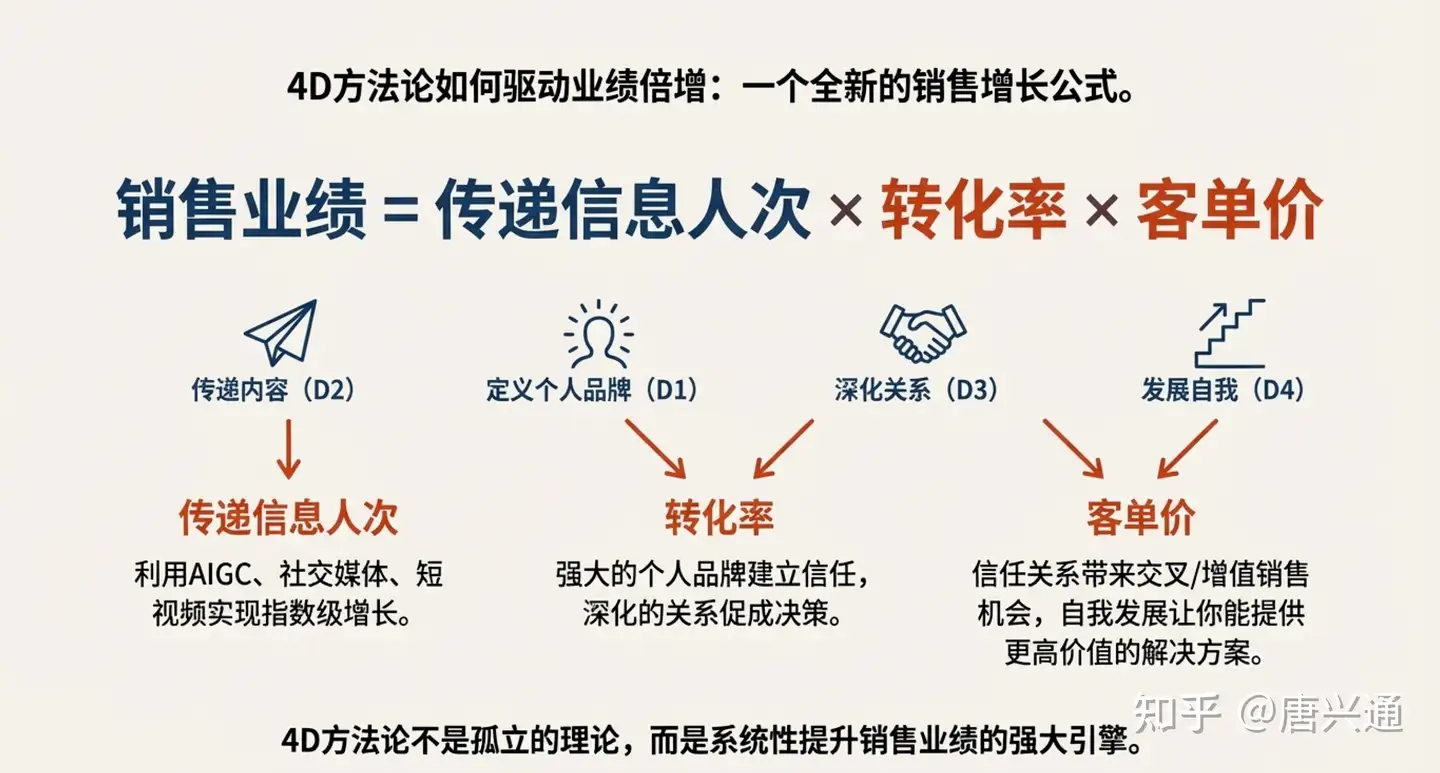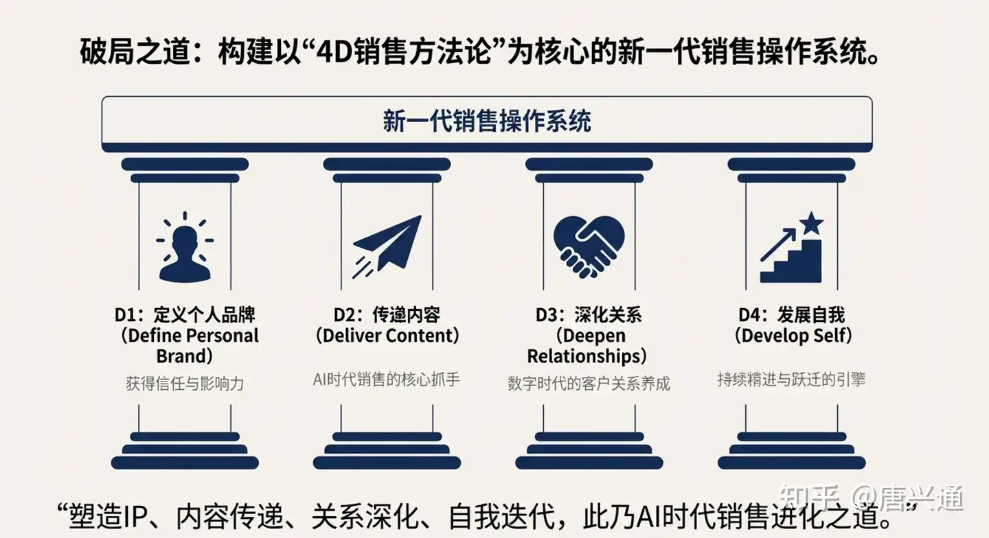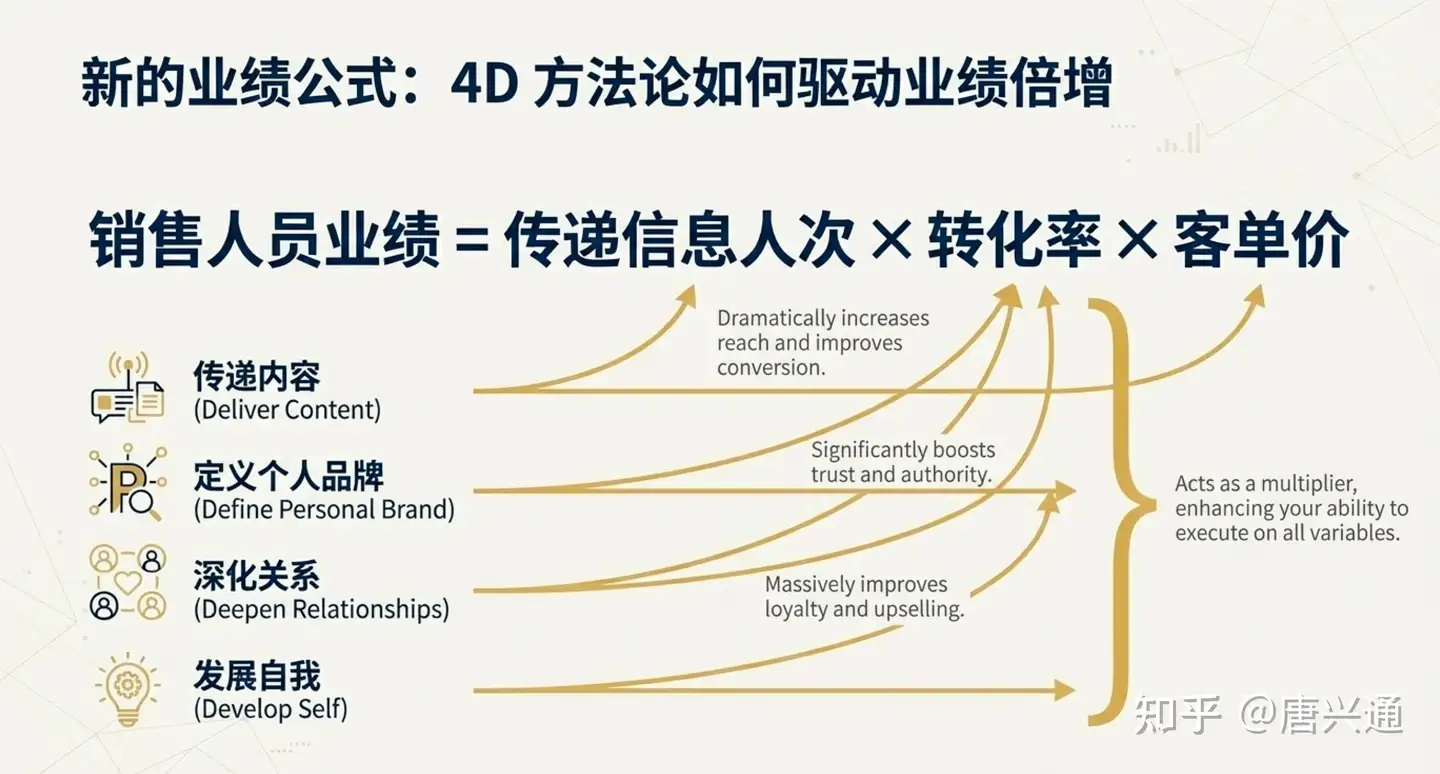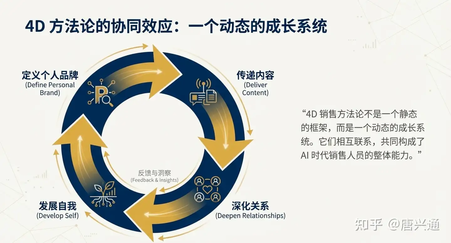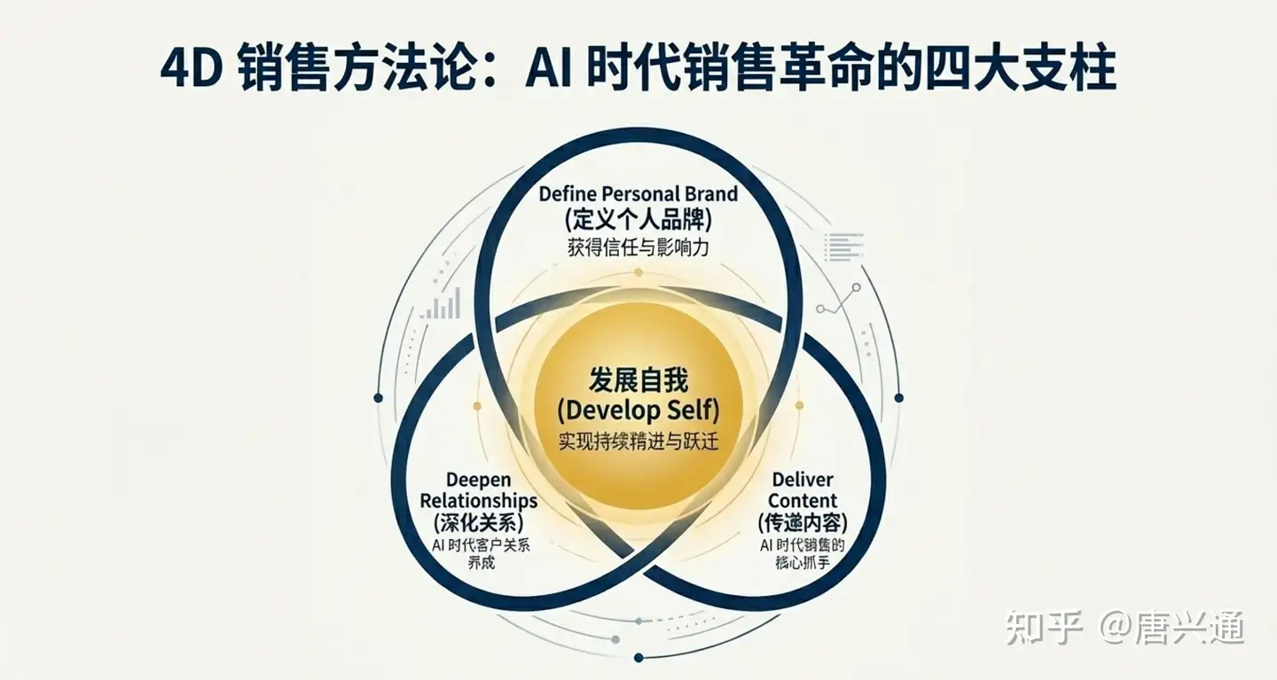 在当今AI时代,销售人员需要不断地适应和进化,以应对不断变化的市场环境和技术发展。为了在这种竞争激烈的环境中脱颖而出,销售人员需要具备4D销售力模型:定义个人品牌(Define Personal Brand)、传递内容(Deliver Content)、深化关系(Deepen Relationships)和发展自我(Develop Self)。这四个维度之间不仅相互独立存在,而且彼此之间有着紧密的联系,共同构成一个有机的整体,帮助销售人员在数字销售领域取得成功。