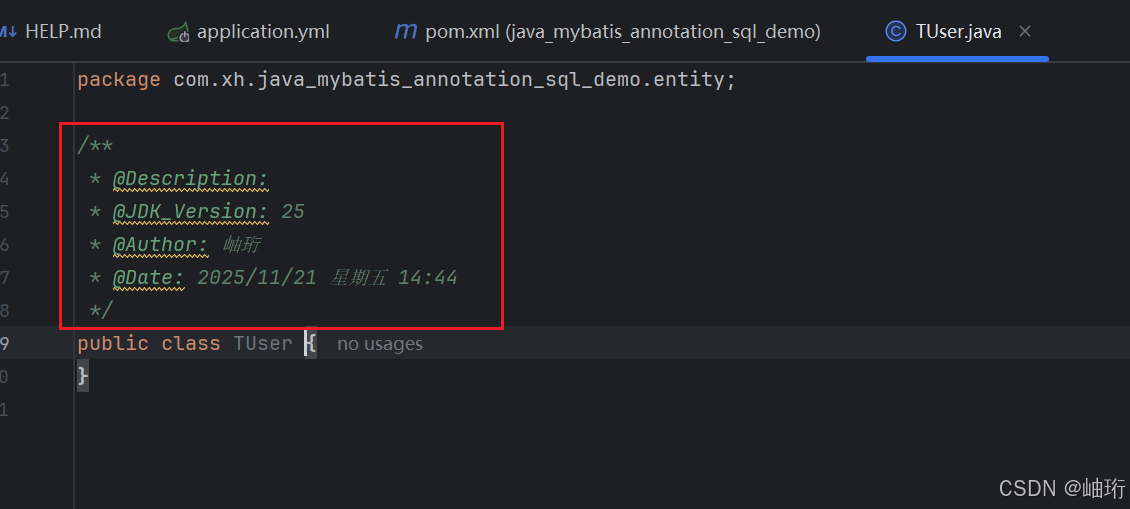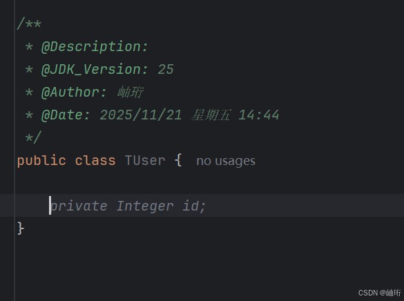 若希望在生成的类文件中自动添加注释信息(如下所示),可以通过以下方式实现: